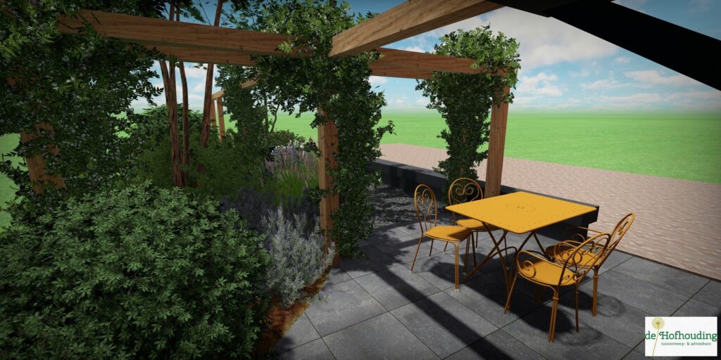 Een mooie diepe voortuin op het zuiden, daar wil je met name een lekker terras wat door het groen voldoende privacy geeft.