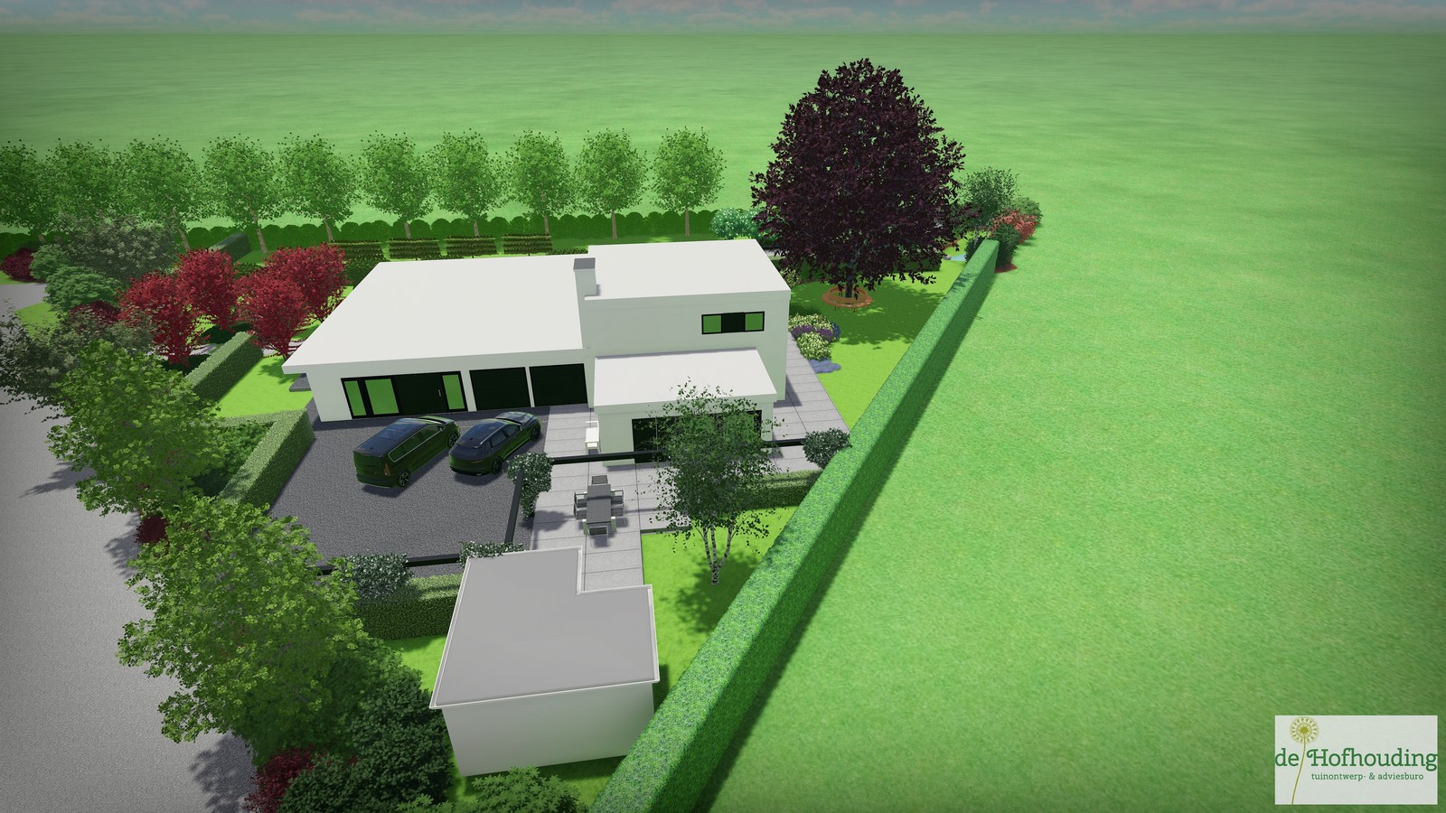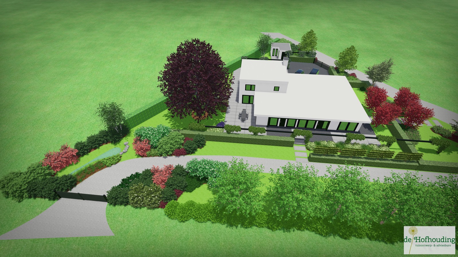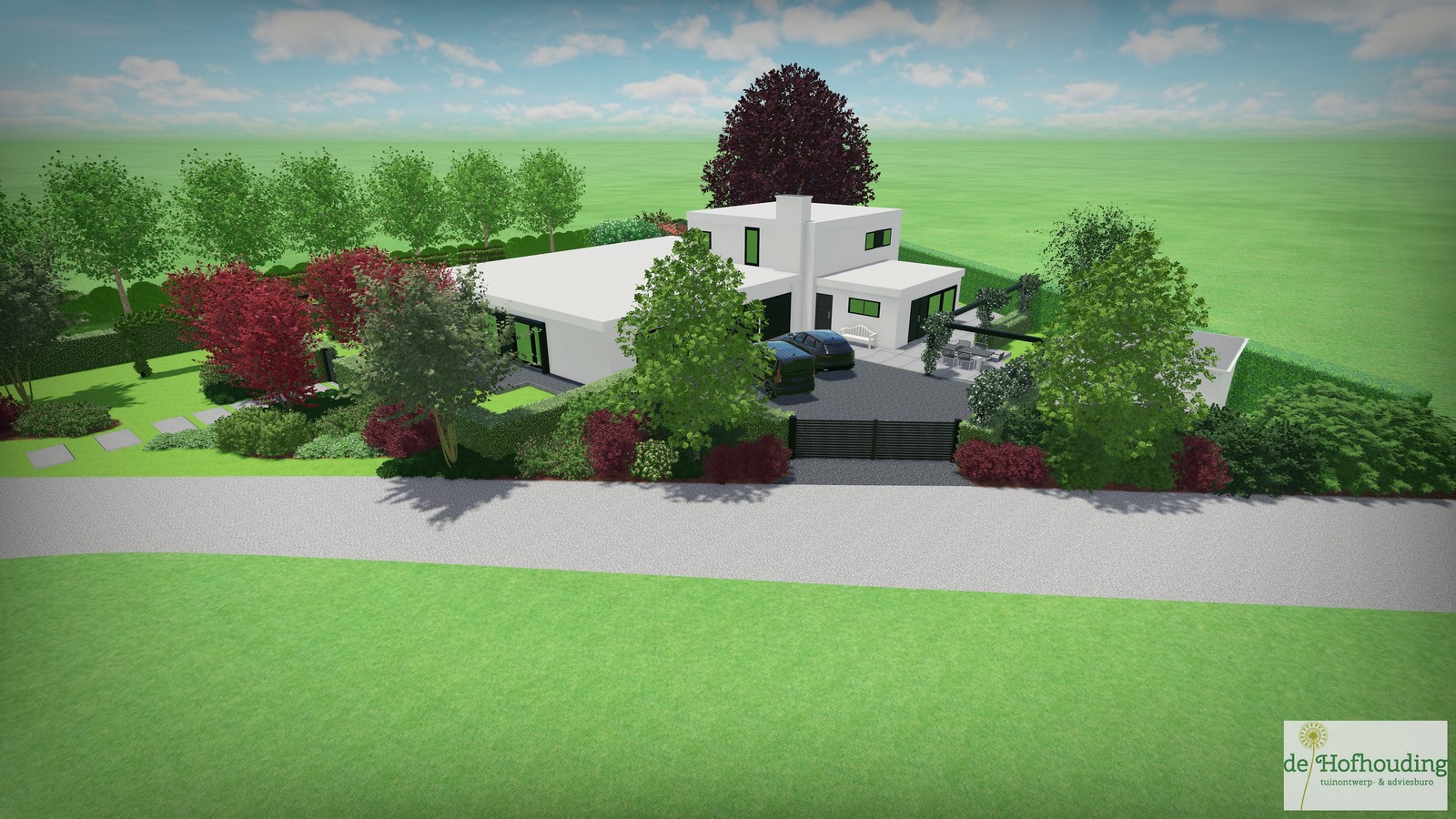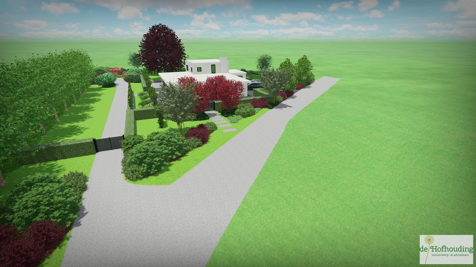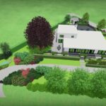 Een groot perceel met een grote moderne woning. Door strakke lijnen te combineren met natuurlijke beplanting wordt het één geheel met de ligging buiten de bebouwde kom.