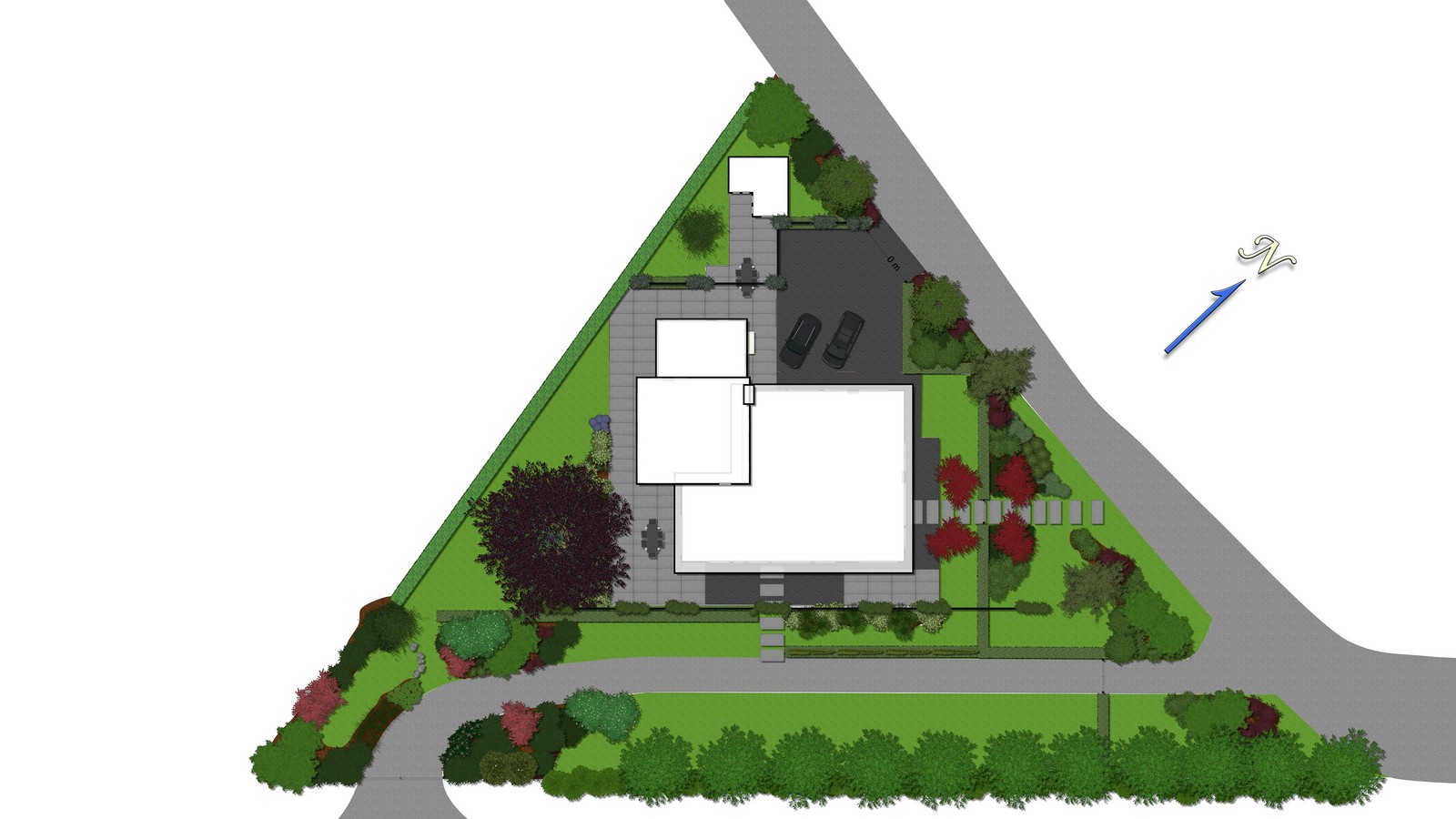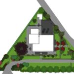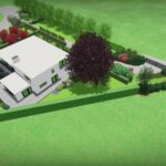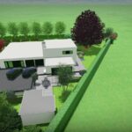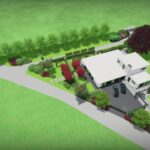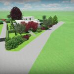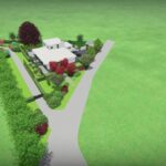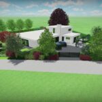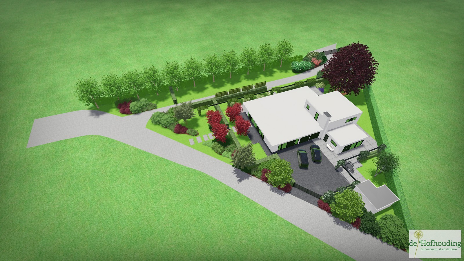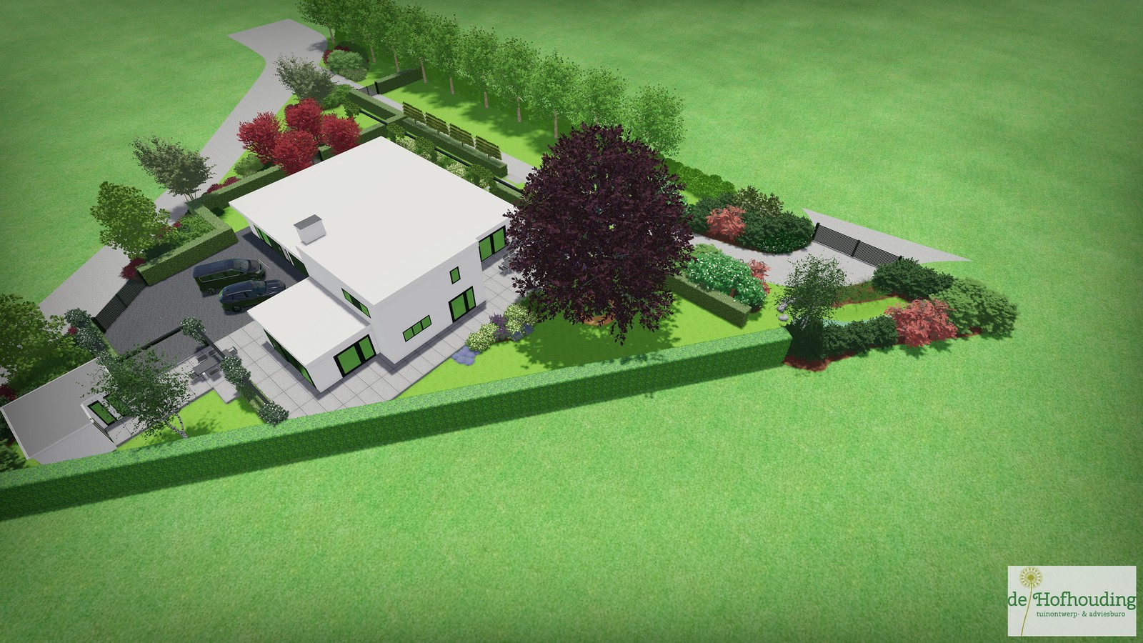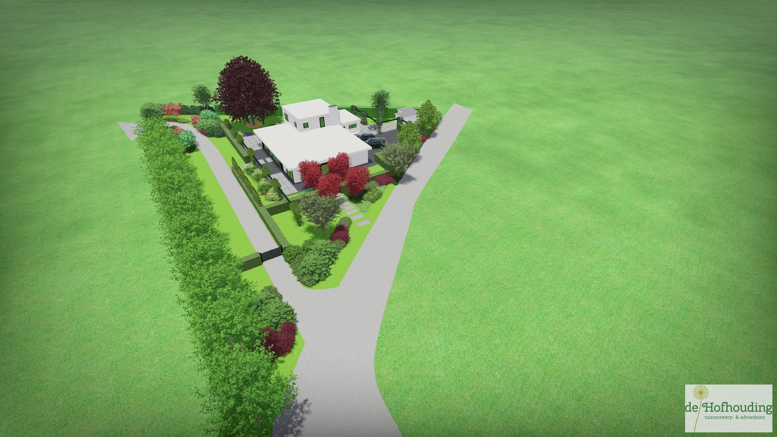Een groot perceel met een grote moderne woning. Door strakke lijnen te combineren met natuurlijke beplanting wordt het één geheel met de ligging buiten de bebouwde kom.