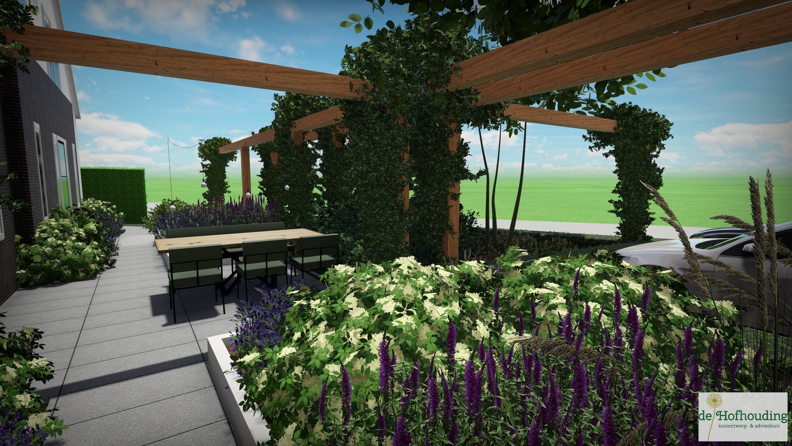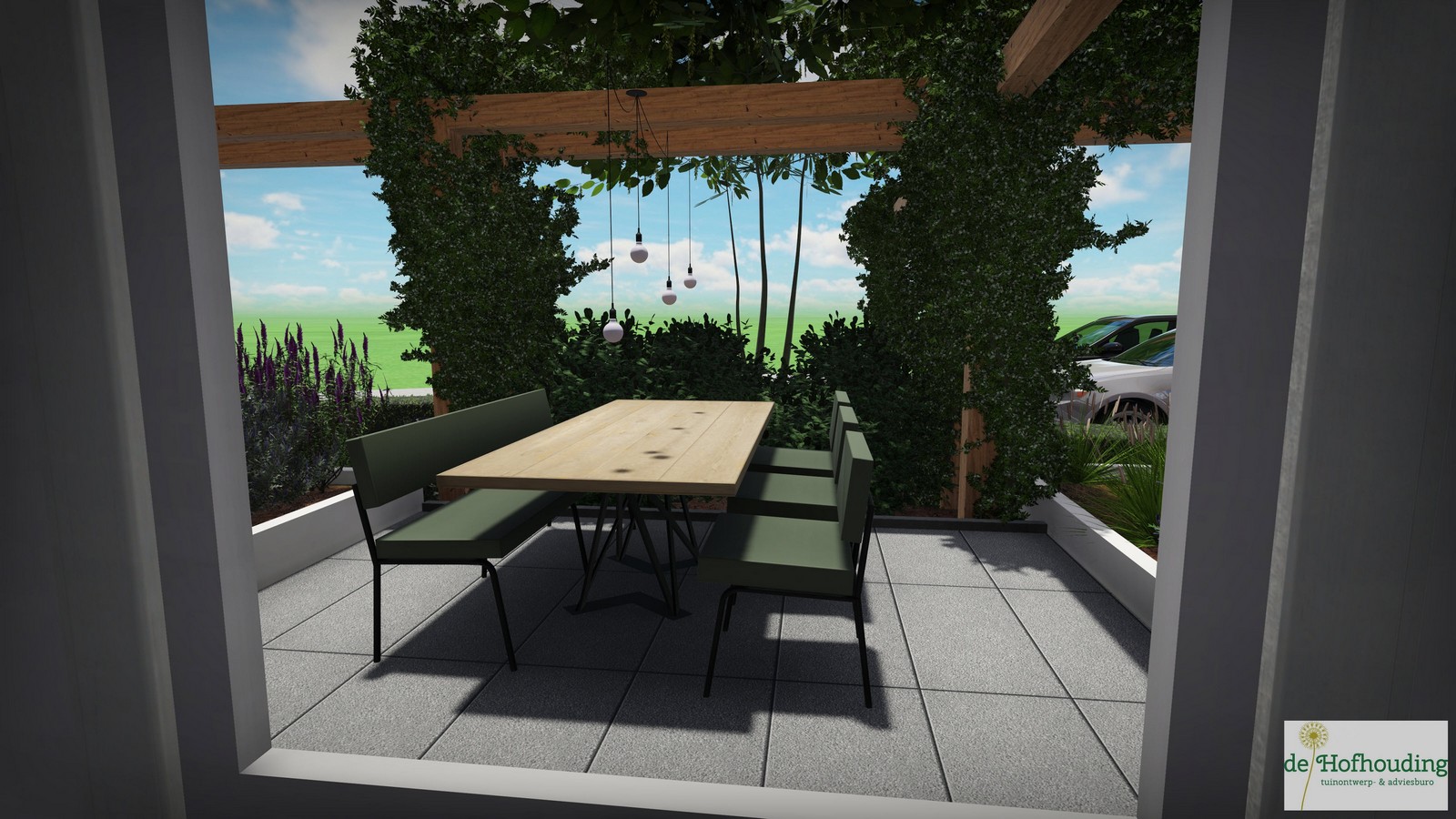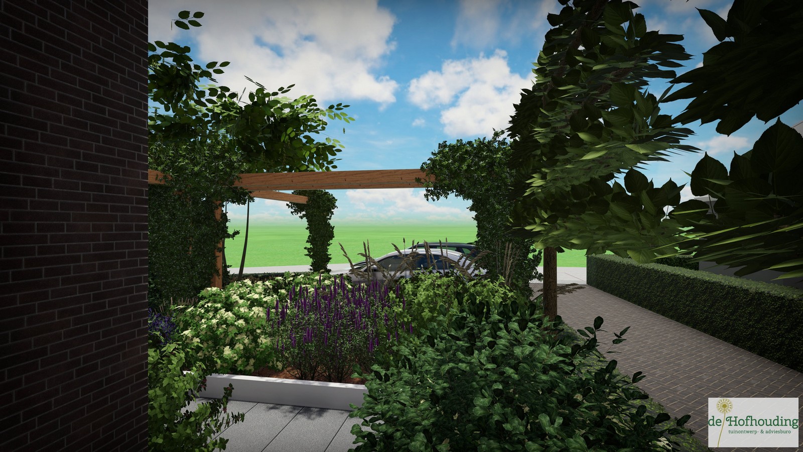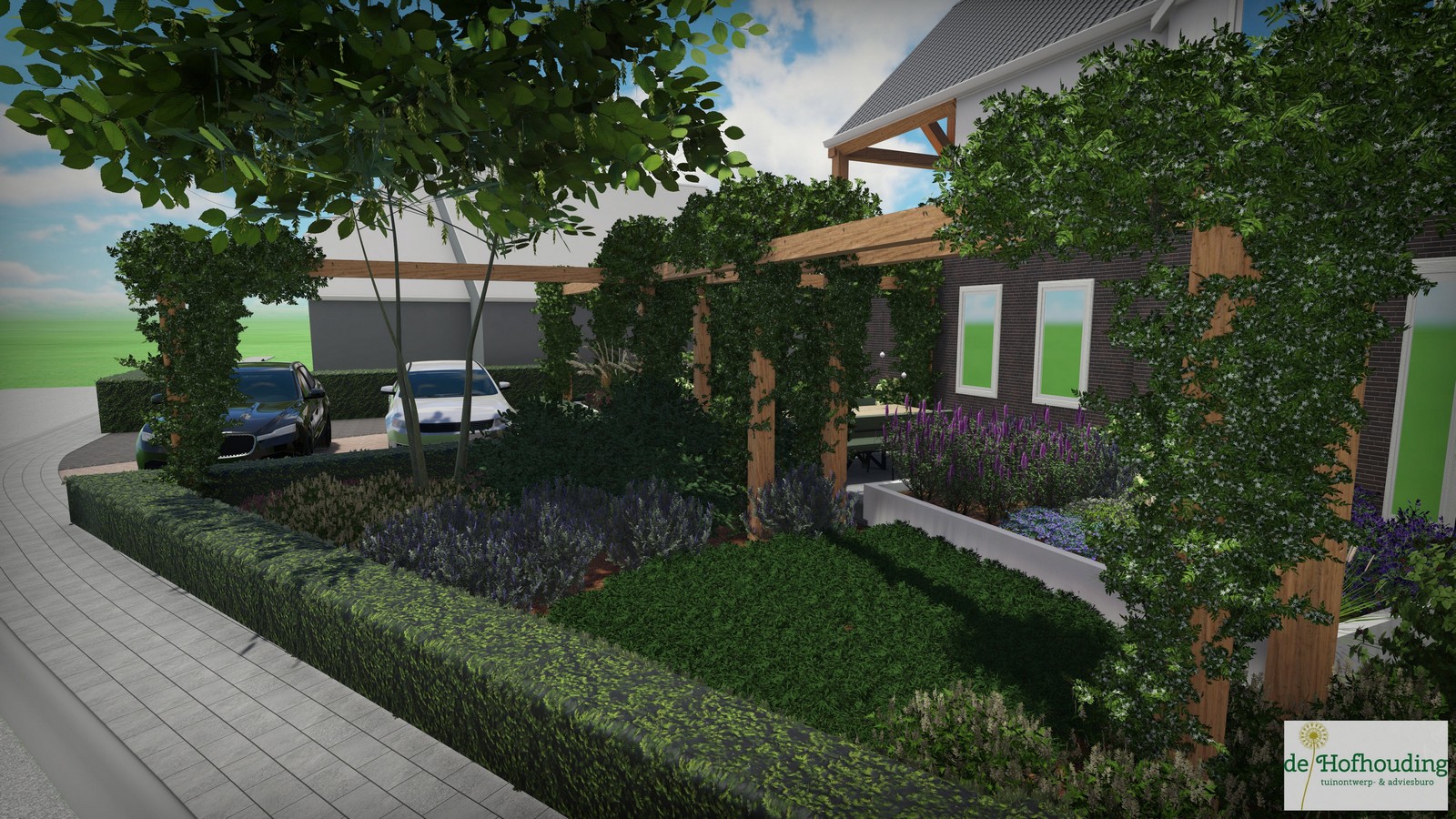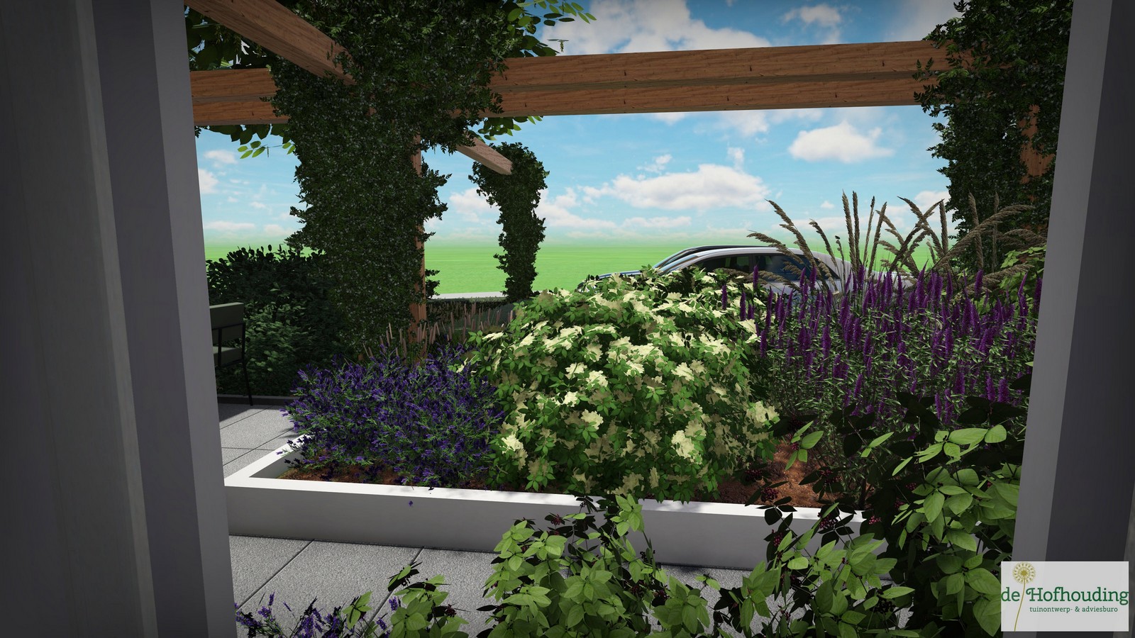 Omschrijving De voortuin bij een appartementencomplex leek niet groot maar door de aansluiting van de mooie robuuste pergola met het gebouw lijkt de tuin ineens een stuk groter.