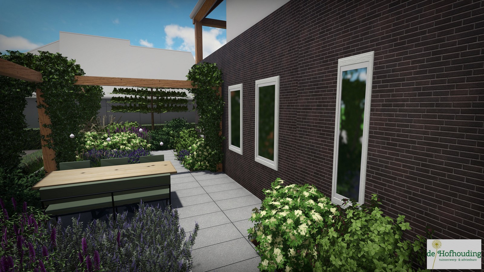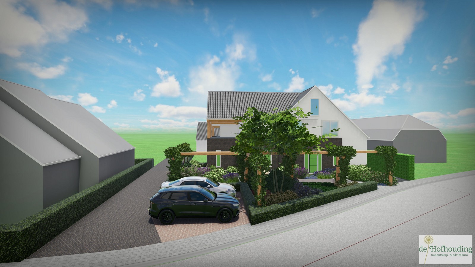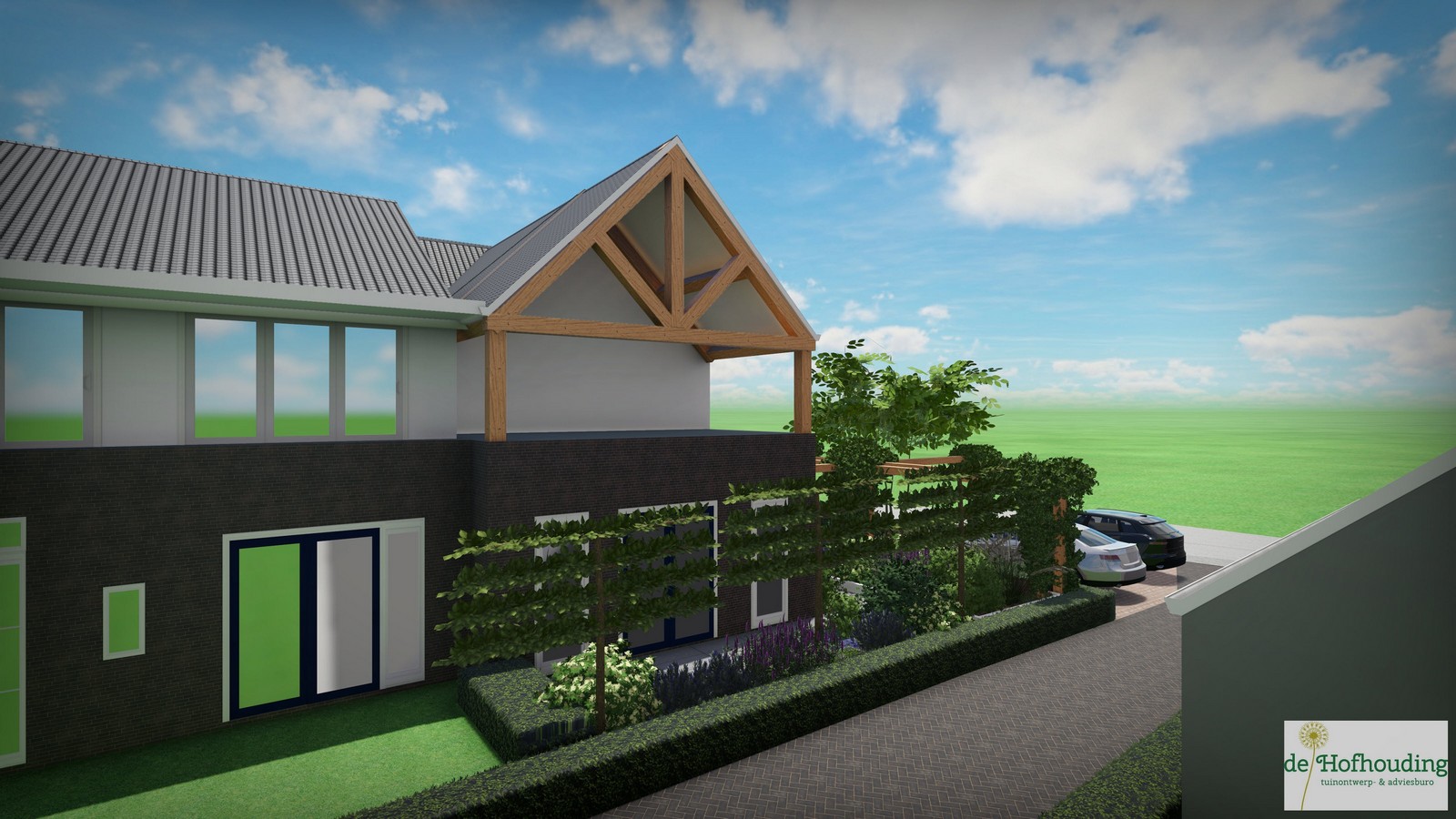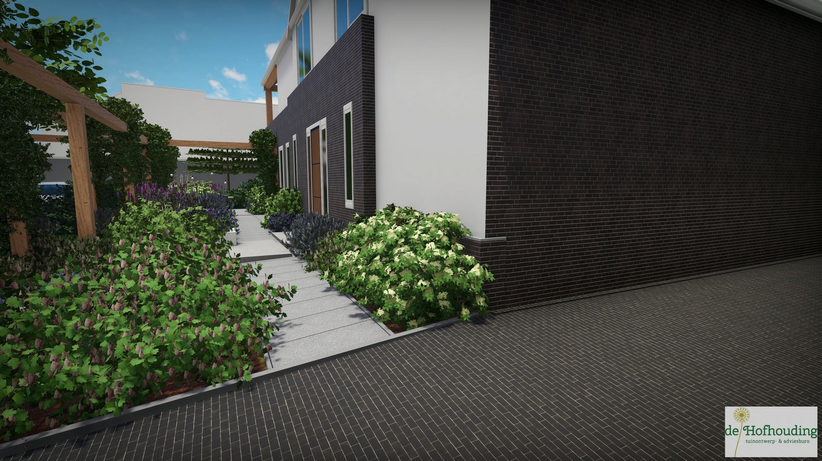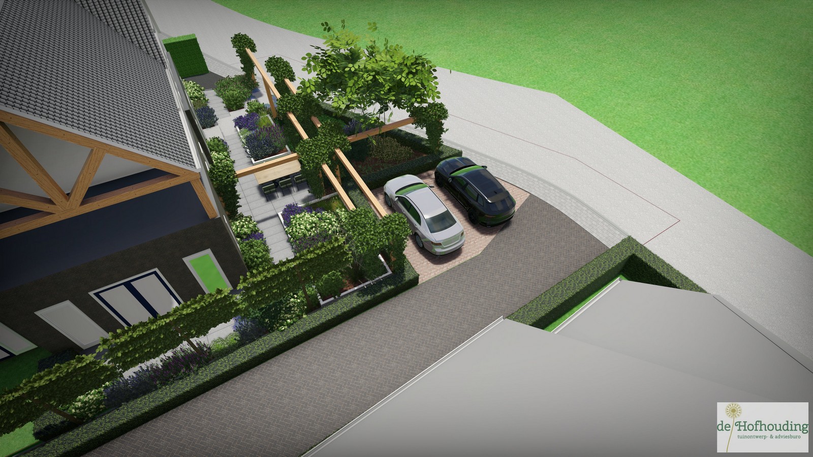 Omschrijving De voortuin bij een appartementencomplex leek niet groot maar door de aansluiting van de mooie robuuste pergola met het gebouw lijkt de tuin ineens een stuk groter.