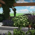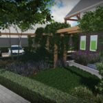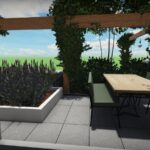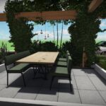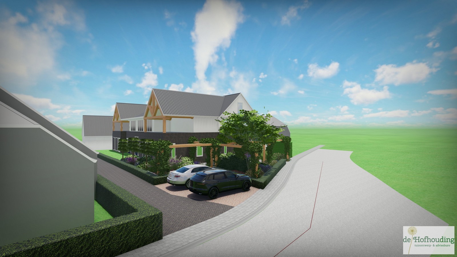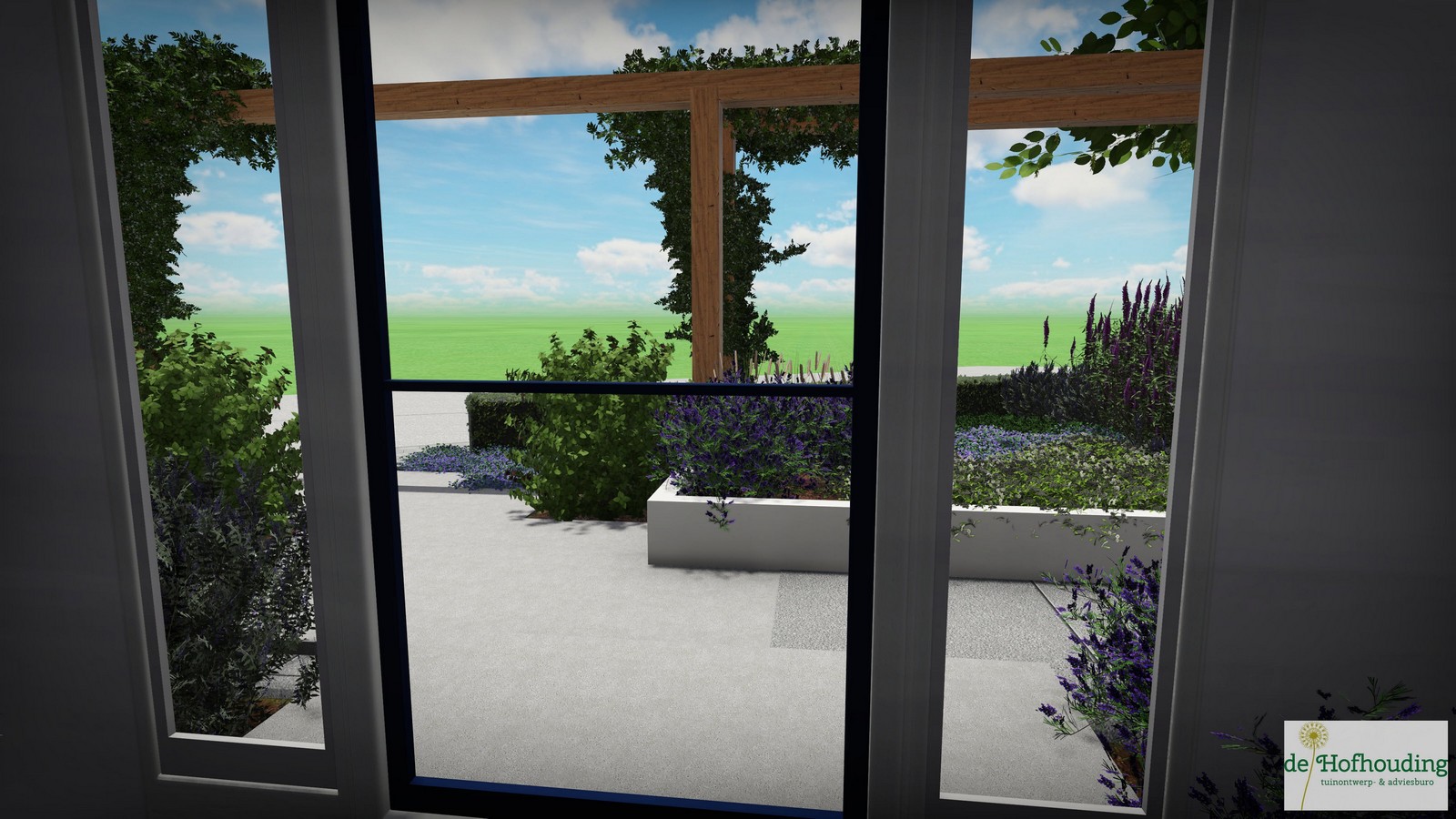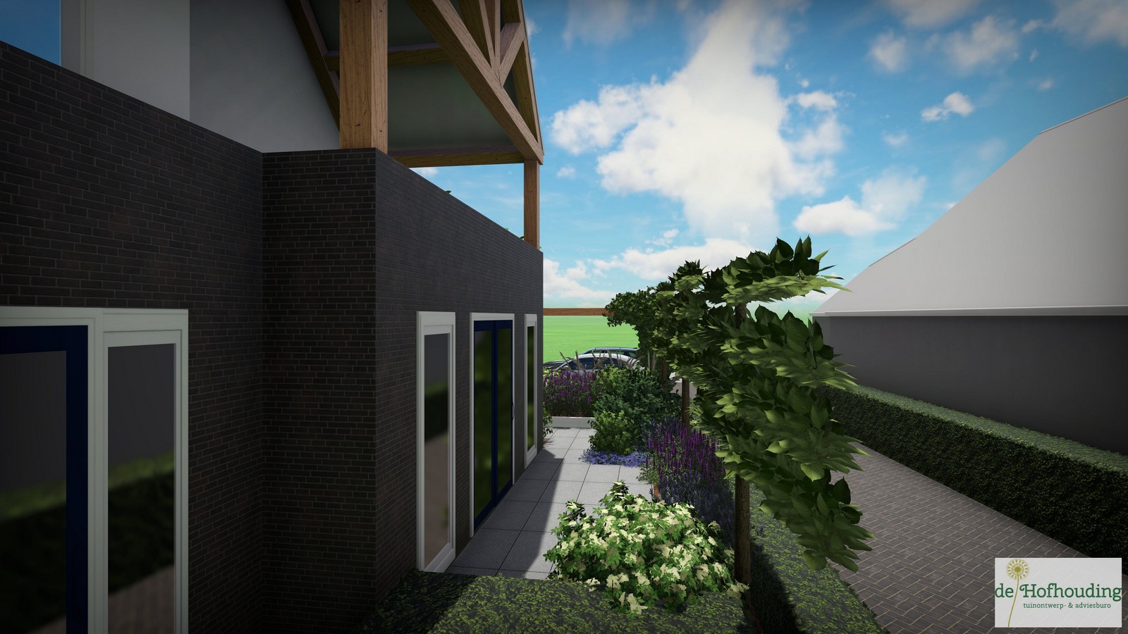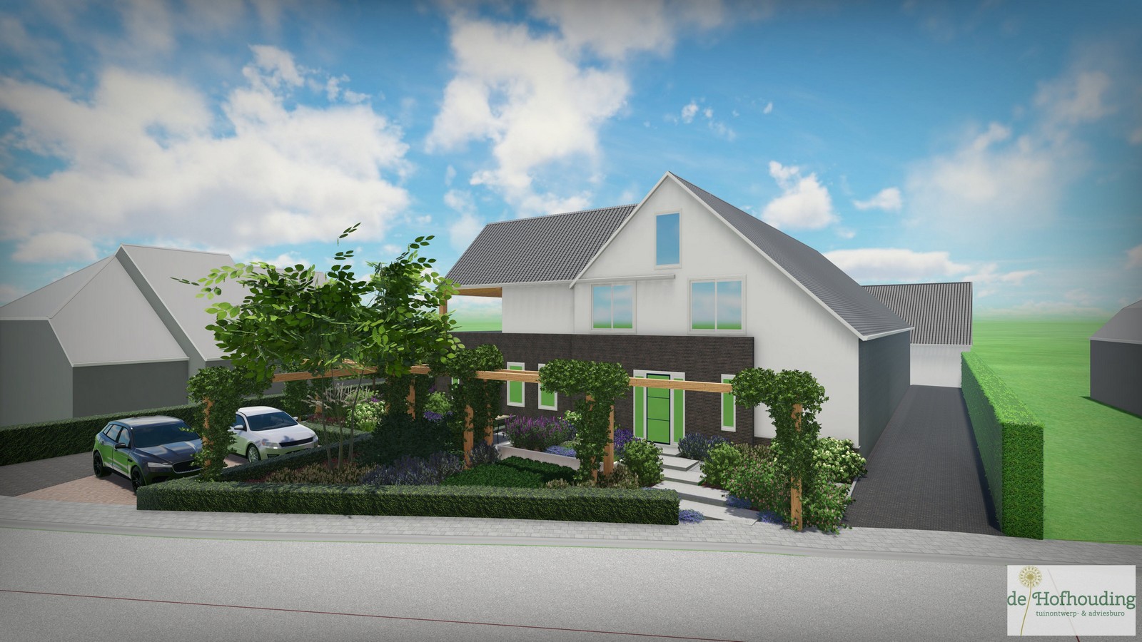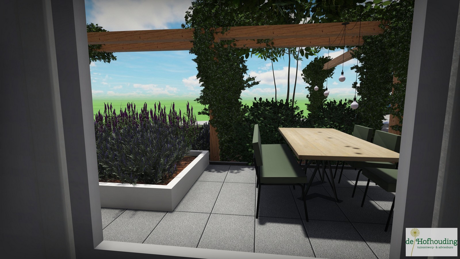 Omschrijving De voortuin bij een appartementencomplex leek niet groot maar door de aansluiting van de mooie robuuste pergola met het gebouw lijkt de tuin ineens een stuk groter.